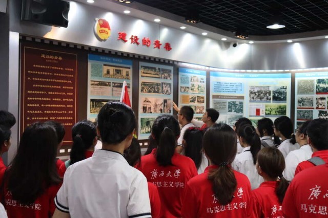 广西大学马克思主义学院把“思政课”搬到红色研学基地中,通过大中学生“牵手”同上一门思政课的方式,在参观学习的基础上,通过团史宣讲和重温入团誓词等方式,将思政元素融入研学课题中,让团史以一种更加鲜活的方式呈现。