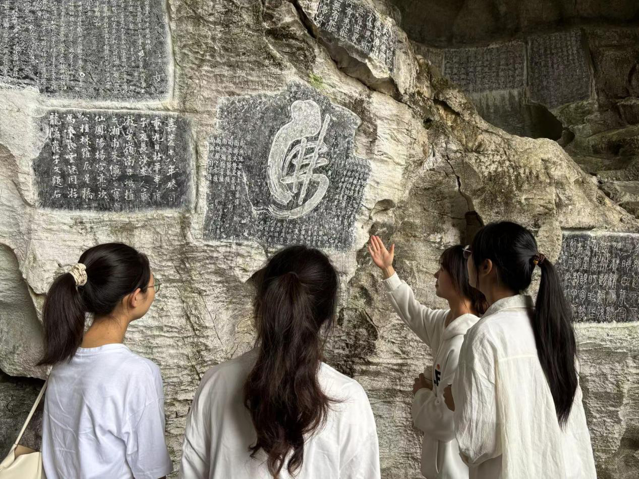 “太震撼了!一方岩洞内竟然保存了从唐代至民国的200多幅石刻,我好像一瞬间触摸到了桂林1700余年的灿烂石刻史!”行走在由龙隐洞、龙隐岩两处石刻组成的摩崖石刻群中,青年学子张雯清惊叹不已。看山如观画,游山如读史。同学们跟随讲解员的脚步,借岩壁上的石刻与先贤建立起一场跨时空的“精神交流”,在一部部“藏在山水间的编年史书”中追溯桂林城的来处,领略桂林石刻文化的力量。