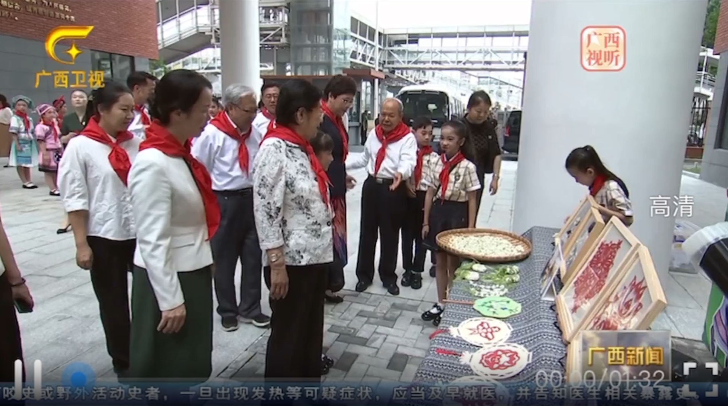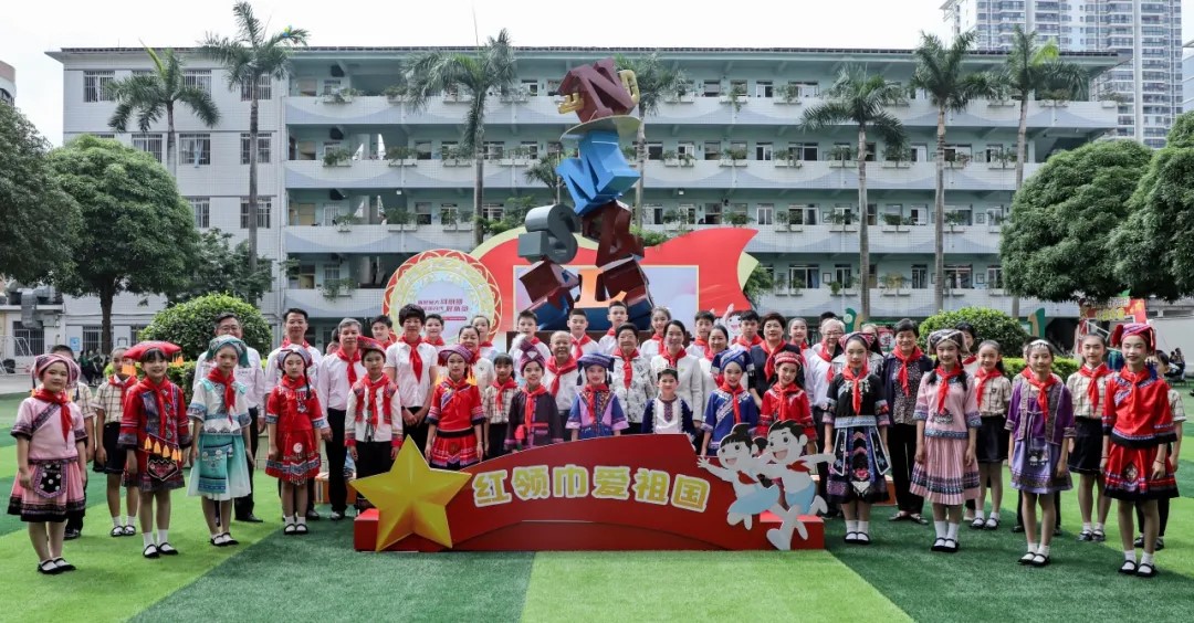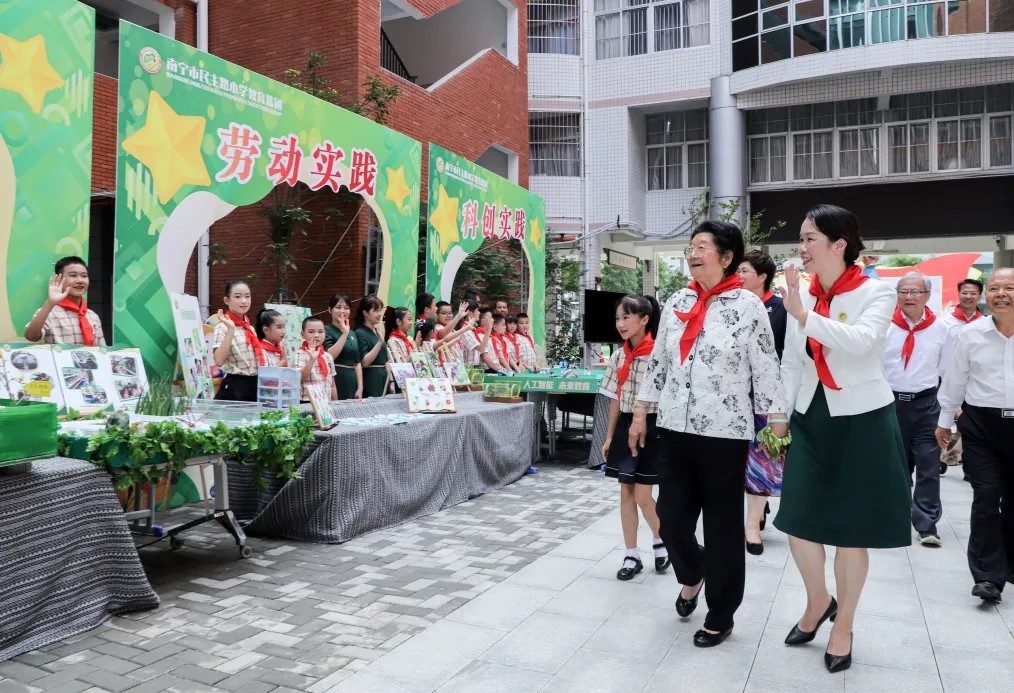 南宁市民主路小学的少先队员们以热情洋溢的壮乡《迎客歌》迎接到场的领导嘉宾,并向他们敬献红领巾。红领巾讲解员带领大家参观“红领巾爱学习——我是祖国未来建设者”特色展示区,详细介绍学校在传统文化、生态文明、科创实践、劳动实践方面开展的特色实践教育成效。