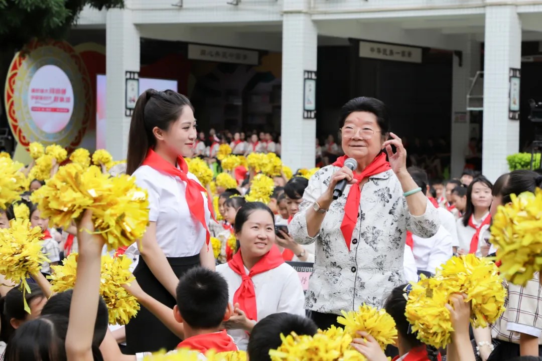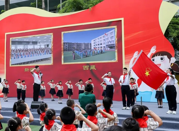 在主题队日活动中,顾秀莲为少年儿童送上节日祝福。队员们通过朗诵、童谣、歌舞表演、情景剧等丰富多彩的展示形式共同交流,从小铸牢中华民族共同体意识,为绘就民族复兴、民族团结、强国建设的最大同心圆增添色彩,表达了三地少先队员们心中有党,心怀梦想、勇于担当、苦学本领的少年壮志。活动还邀请了 “希望阅读”公益项目城乡手拉手结对学校宾阳县恭村完小的师生代表来到现场,共同表演节目,欢庆“六一”。