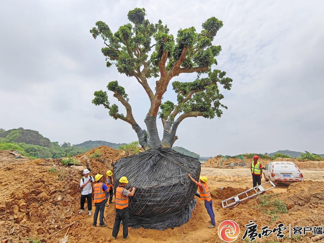 近日,在平陆运河航道1标新福水上服务区施工段,工作人员正在对一棵150年树龄的荔枝树进行挖掘保护,准备移植。记者 徐天保 摄