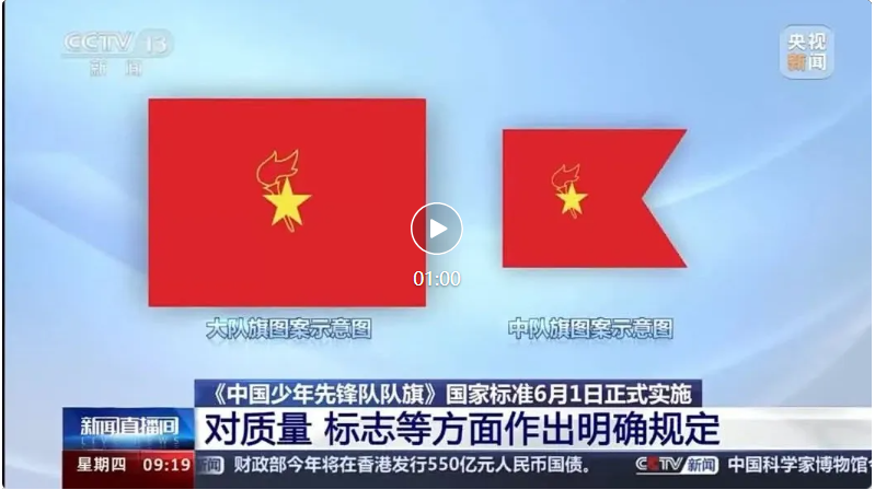 《中国少年先锋队队旗》(GB/T 43600—2023)国家标准将于2024年6月1日正式实施。该标准由市场监管总局(国家标准委)批准发布,共青团中央、全国少工委会同相关单位编制。