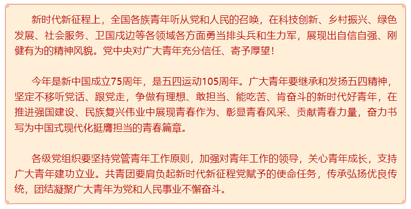 今年五四青年节到来之际,中共中央总书记、国家主席、中央军委主席习近平代表党中央,向全国广大青年致以节日祝贺和诚挚问候,并寄语新时代新青年奋力书写为中国式现代化挺膺担当的青春篇章。