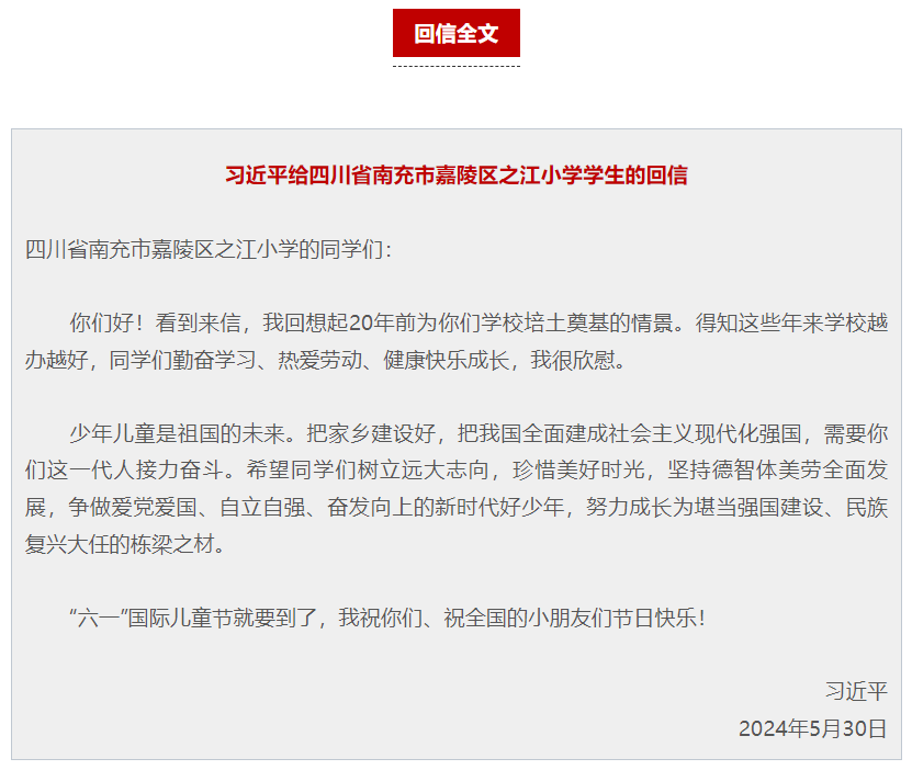 在“六一”国际儿童节即将到来之际,中共中央总书记、国家主席、中央军委主席习近平5月30日给四川省南充市嘉陵区之江小学的学生们回信,对他们予以亲切勉励,并祝他们和全国的少年儿童节日快乐。