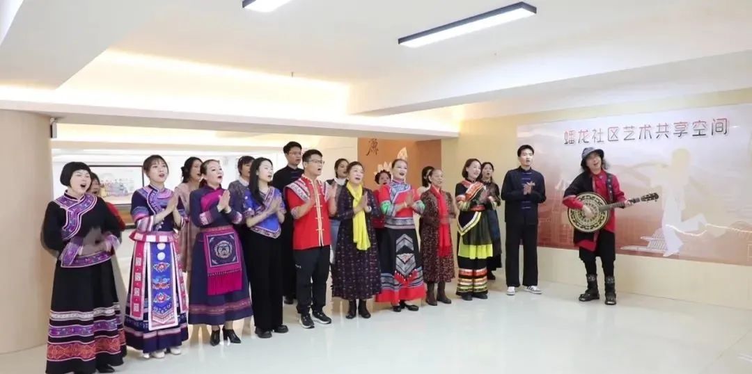 ▲在蟠龙社区新时代文明实践站,广西文化旅游推广大使、社区志愿者赵羽(右一)和社区各族群众排练山歌《幸福嘹嘹啰》。