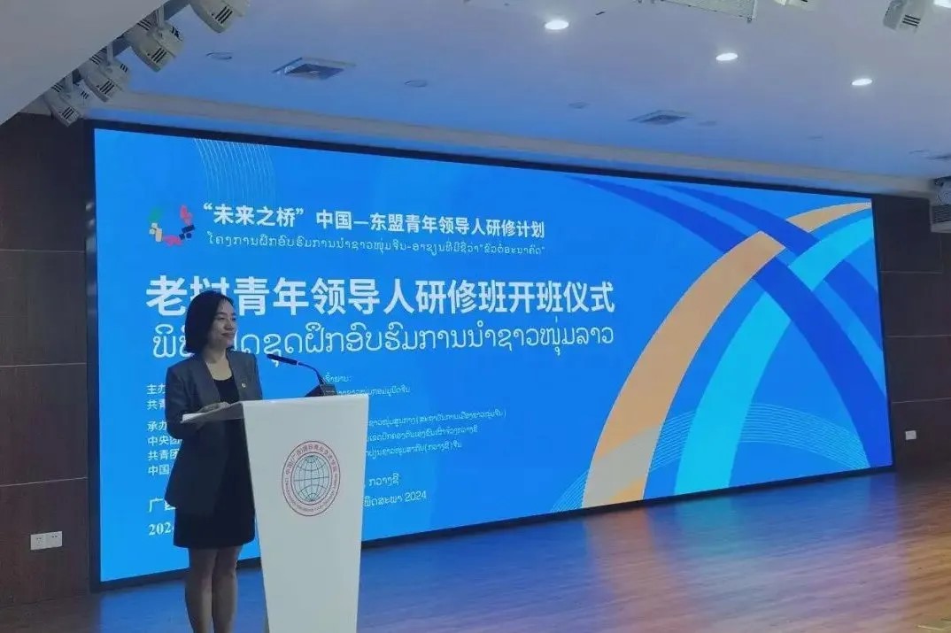 5月14日,由共青团中央主办的老挝青年领导人研修班在广西南宁举行开班仪式。共青团广西区委副书记、广西青年联合会副主席左向蕾,老挝沙耶武里省党委委员、老挝人民革命青年团中央委员、老挝人民革命青年团沙耶武里省委书记努赛·诺奇亚出席开班仪式。