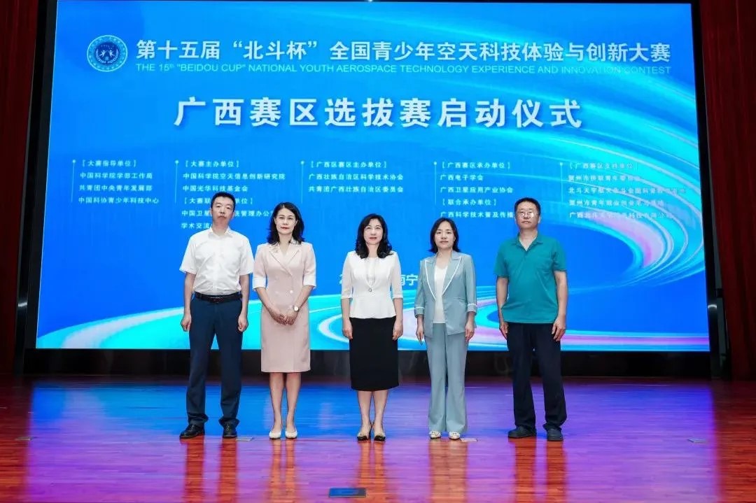 5月13日,第十五届“北斗杯”全国青少年空天科技体验与创新大赛广西赛区选拔赛启动仪式在南宁市科技馆科学会堂举办。自治区科协党组成员、副主席黎宁,共青团广西区委副书记、广西少工委主任左向蕾出席活动。全区14个设区市300多所中小学校校长、科技教师代表参加活动。