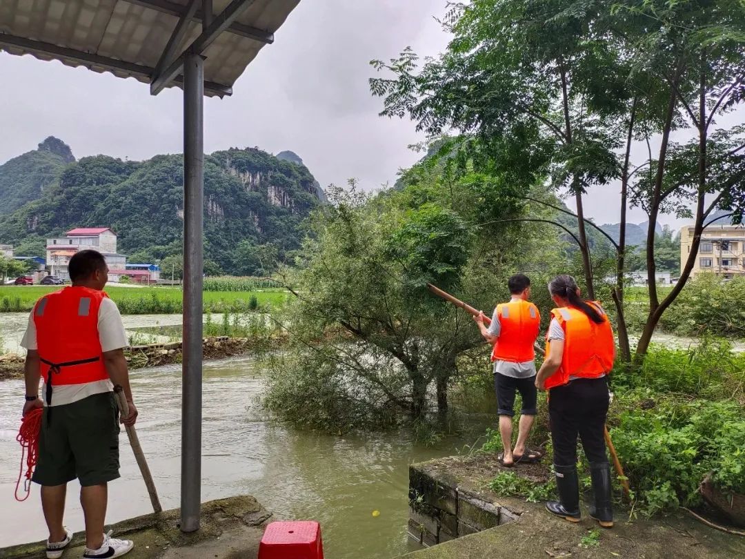 汛情当前,桂林市辖区各街道社区的青年志愿者闻“汛”而动,在一线查看水情并提供志愿服务,倾力守护群众生命财产安全。在七星区和平村,党员干部和青年志愿者组成临时“防汛救援队”。不分时段对低洼处、易涝点、老旧危房等易发生安全隐患的区域进行排查,对存在隐患的重点区域和地段设置警示柱、警戒线,提醒过往村民和车辆绕道而行。