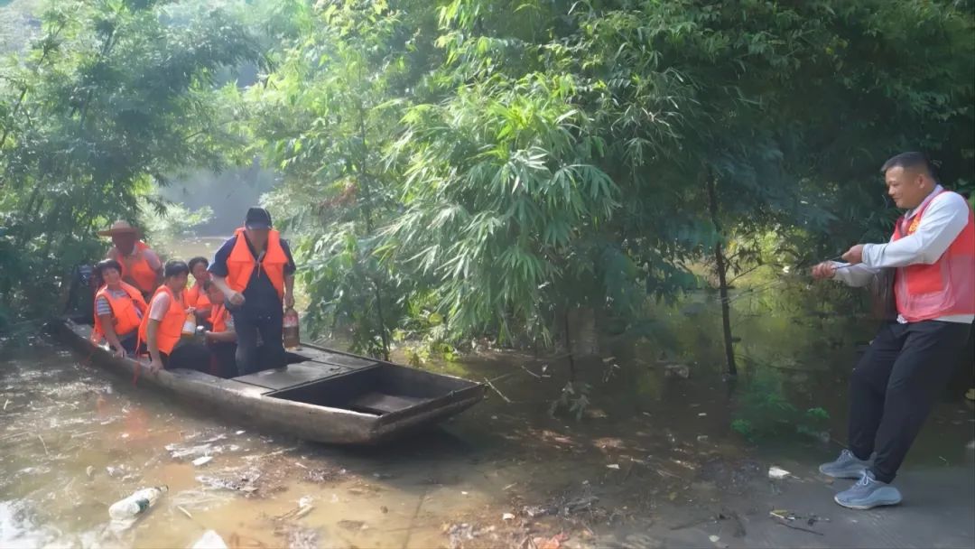 青年志愿者划着渡船,将村民安全送达目的地,全力保障群众的生命安全