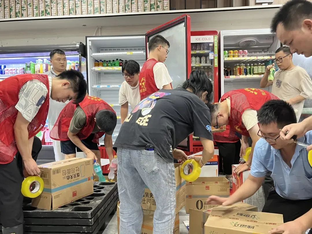鱼峰区青年志愿者协助商家打包货物,以最快的速度搬运到安全区域,全力保障群众财产安全