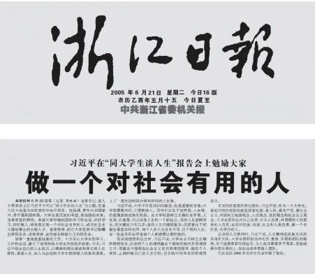 ※ 2005年6月21日,《浙江日报》头版刊发报道《习近平在“同大学生谈人生”报告会上勉励大家做一个对社会有用的人》。