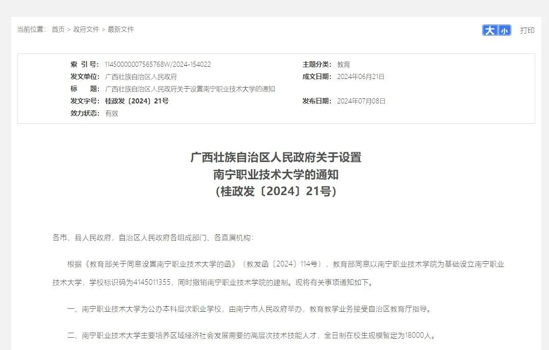 《广西壮族自治区人民政府关于设置南宁职业技术大学的通知》的部分截图。图源自治区人民政府官网