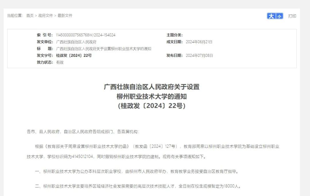 《广西壮族自治区人民政府关于设置柳州职业技术大学的通知》的部分截图。图源自治区人民政府官网
