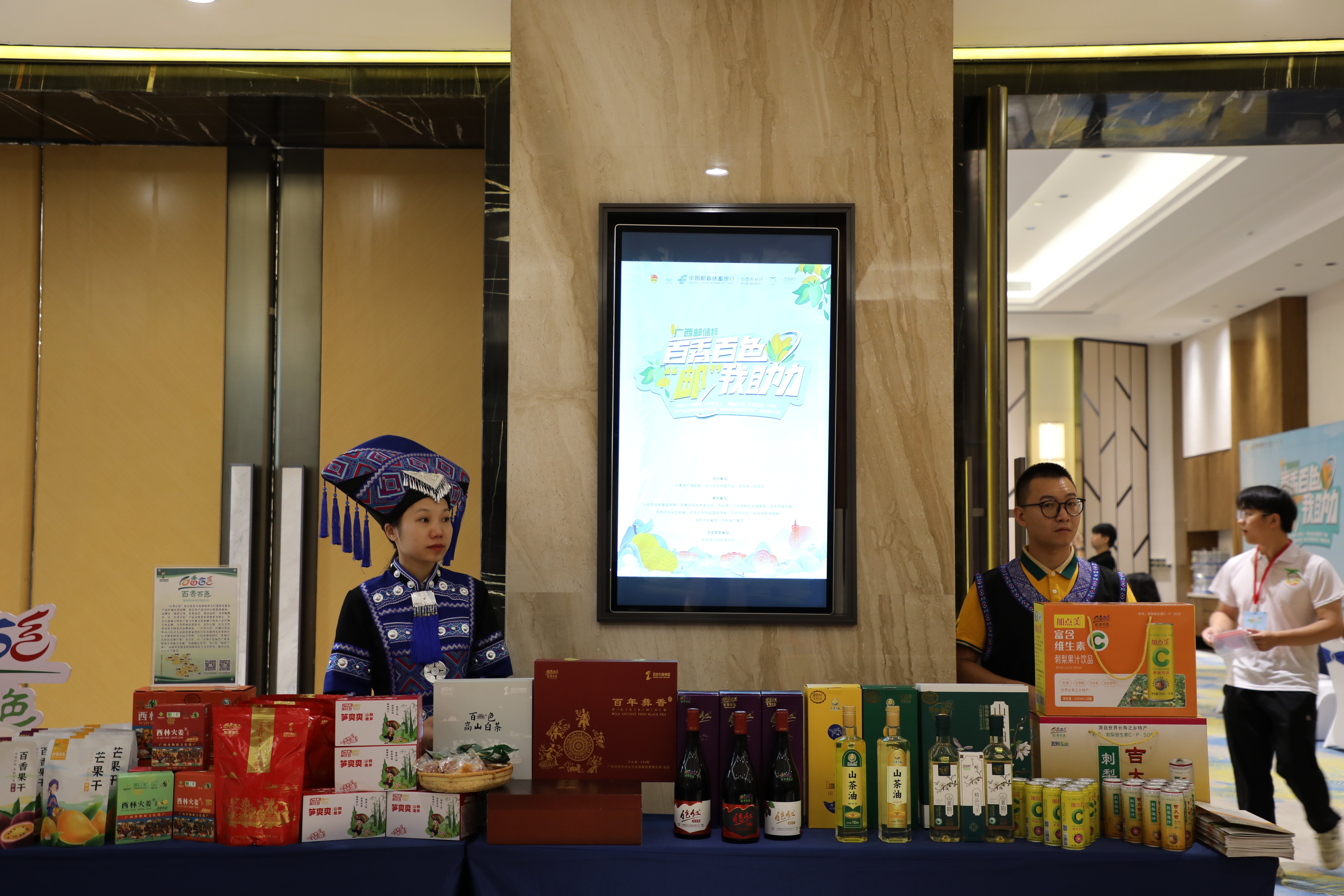 开幕式期间,主办方在现场展示了“百香百色”区域公用品牌授权产品,展出产品包括芒果鲜果,紫衣腰果,茶油,茶叶,红桑果酒,芒果、百香果等水果果脯,刺梨汁、姜晶等饮品,麽乜、绣球等非遗文创产品。