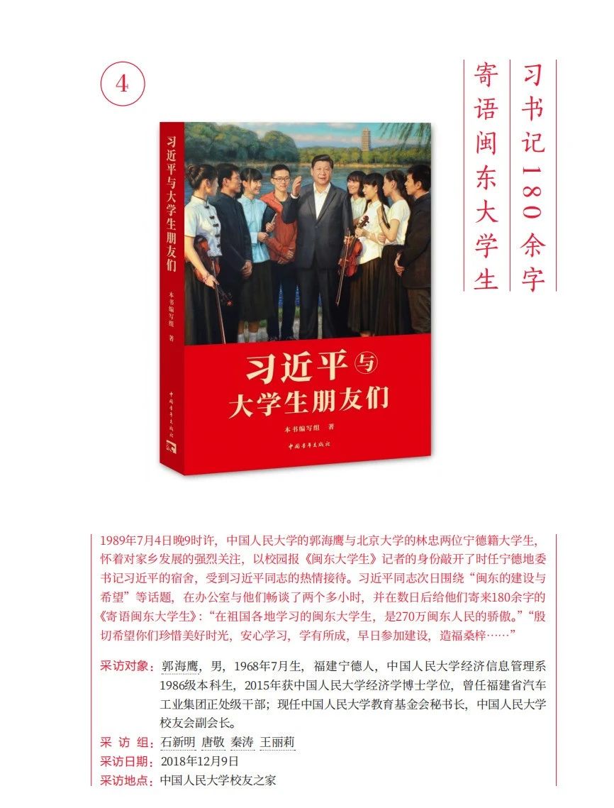 郭海鹰:习近平同志1989年担任宁德地委书记时,与中国人民大学、北京大学的两名同学畅谈了一个上午;1990年担任福州市委书记时,与北京大学、中国人民大学的六十多名同学座谈了一个晚上。这两次座谈交流,我都亲身经历,习近平同志对大学生的关注、关心、关爱令人敬佩和感动。这两次座谈是我终生难忘的大课,对我的人生态度和职业选择都产生了重要影响。