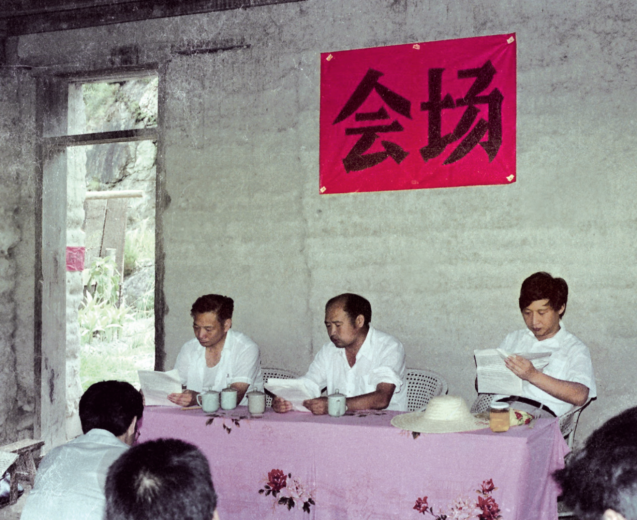 第二张照片记录了习书记在小学校召开现场办公会的情景。当时下党乡没有办公用房,连乡党委办公室都设在一个改造过的牛圈里,这座墙面凹凸不平、连门都没有的土夯学校已是当时“顶级”的会场了。大家将两张课桌拼成了主席台,上面铺了一条从乡亲家借来的花床单,墙上临时写的“会场”二字格外醒目。
