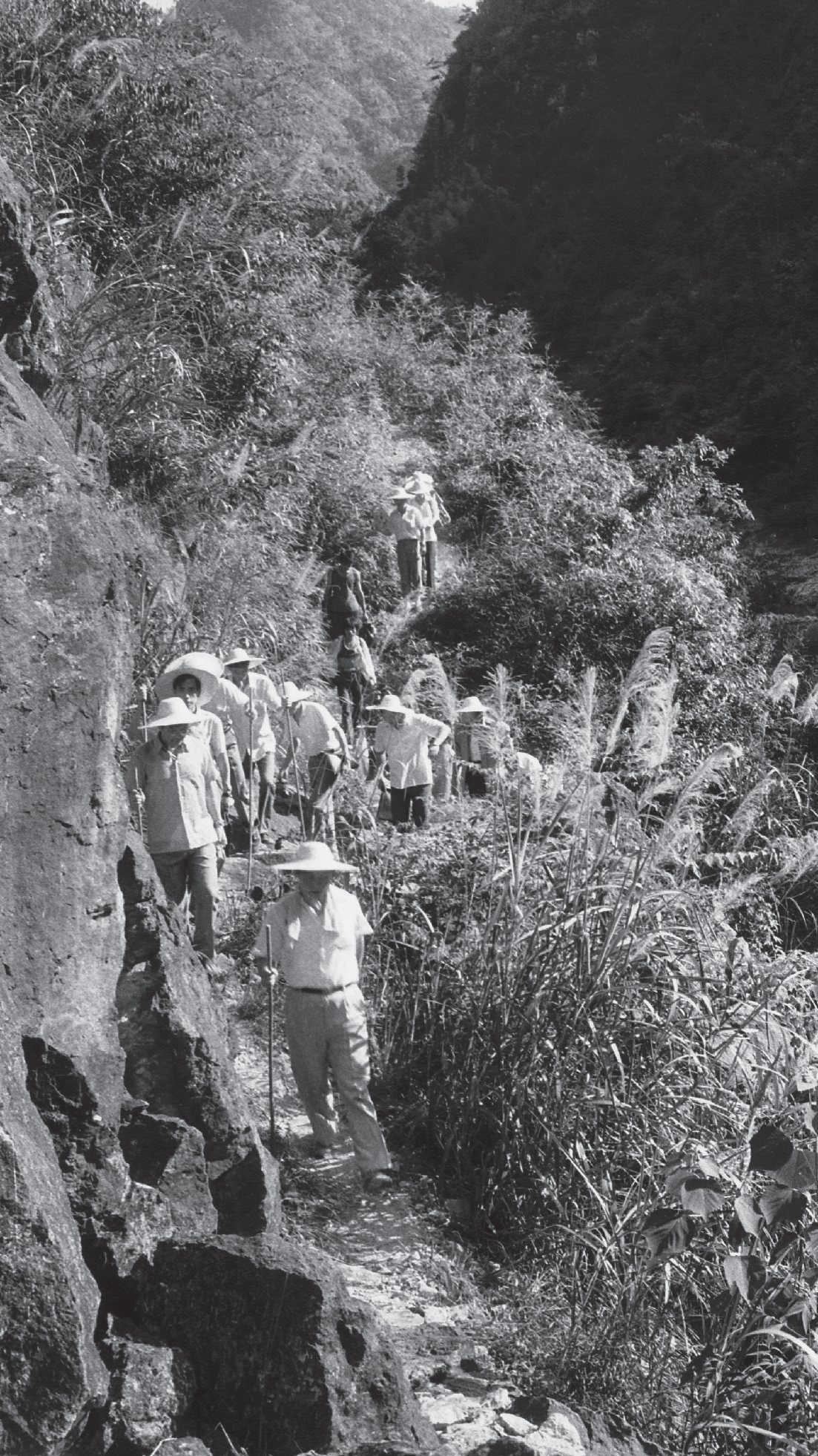 第一张照片记录了习书记一行在下党乡走山路的情形。那是1989年的一个夏日,他们清晨6时从县城出发,约上午9时车开到山下就没路了,然后步行十几里山路,约11点多走到下党乡。一路上老杨拿着一把柴刀在前面开路,大家手持竹竿沿着荆棘丛生的山脊小道而行。走在前面戴着草帽、肩搭毛巾、汗透衣背的高个子就是习书记。下党之行,习书记来回步行4个半小时,听说脚底都磨出了血泡。“披荆斩棘,跋山涉水”,“异常艰苦,异常难忘”,这是习近平同志后来回忆起下党乡时的真切感受。