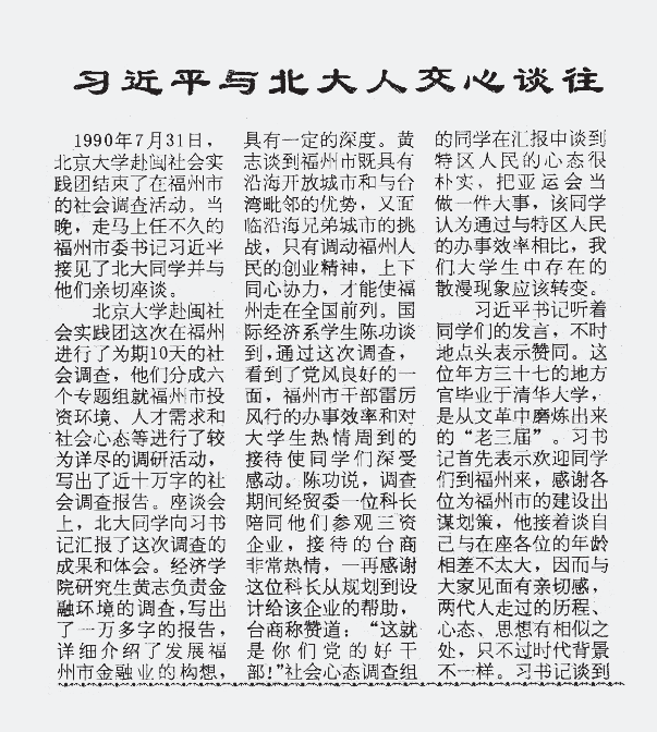 ※ 1991年5月10日,《福建大学生》刊发《习近平与北大人交心谈往》。