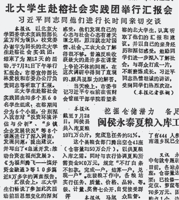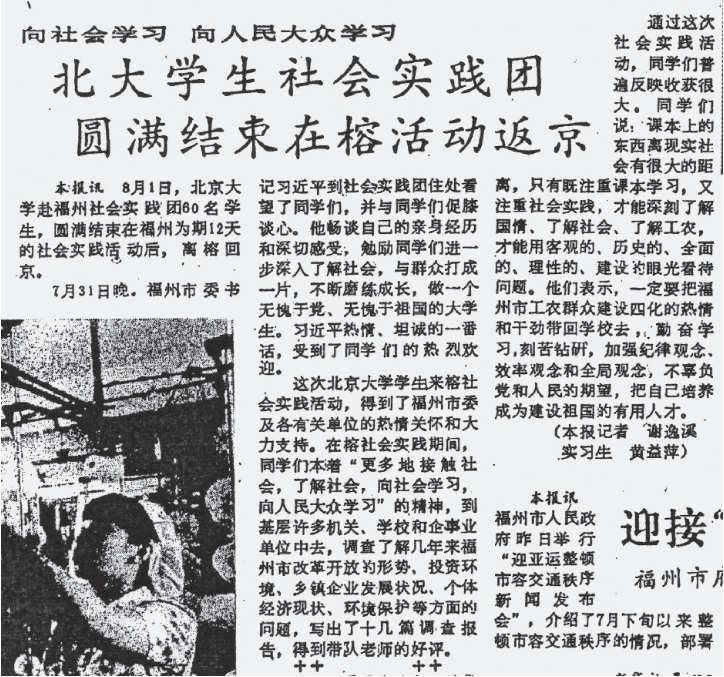 正是在这个背景下,经多方联系,北大福建同学会决定组织同学们赴福州开展社会实践活动。时任福州市委书记习近平同志获悉后非常重视,指示福州市有关部门安排好。北大党委和团委得知后同样高度重视,指定当时的北大团委学术实践部部长带队赴福州指导这次活动。这也是当年北大影响最大的一次社会实践活动。
