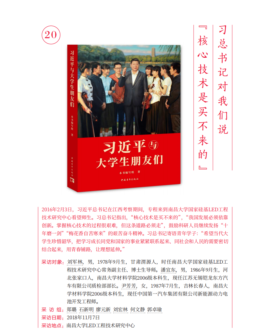 采访组:潘宜东、尹芳芳同志,你们好!这已是习近平总书记第二次到访南昌大学了。早在2008年10月15日,时任中共中央政治局常委、中央书记处书记、国家副主席习近平曾到南昌大学工程训练中心调研并与同学们亲切交谈。请回忆一下当时的情景。