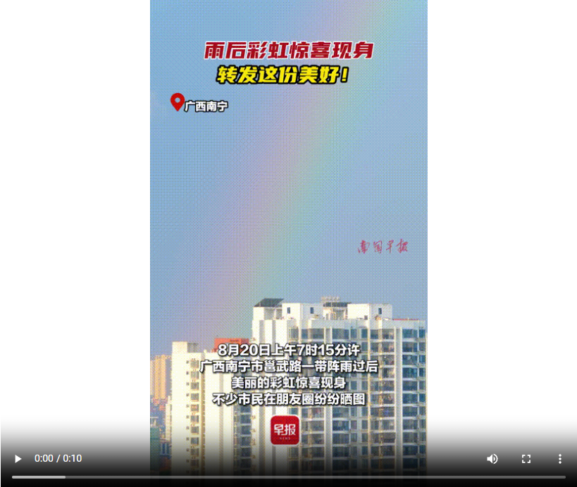 8月20日上午7时15分左右,南宁市邕武路一带出现美丽的彩虹,一些早起的市民看到后,纷纷拍照发朋友圈。有网友感叹是至尊宝来接紫霞仙子了,还是谁的意中人来了?