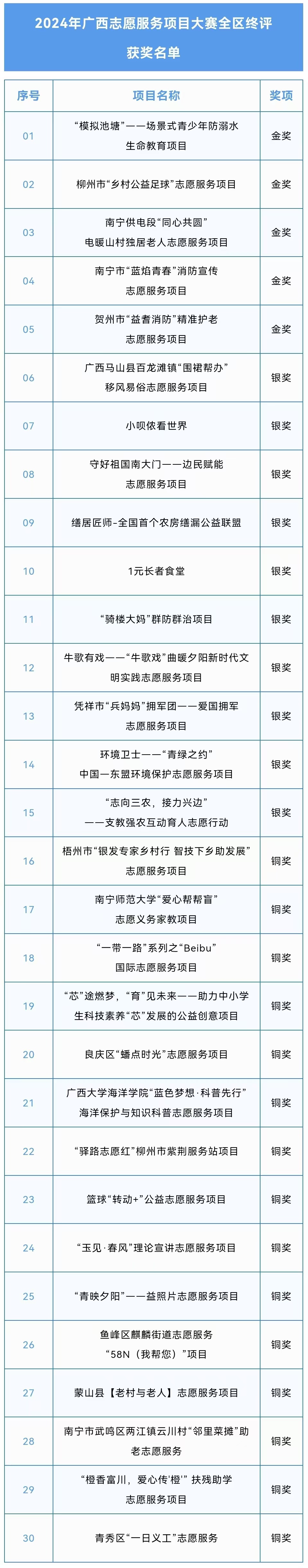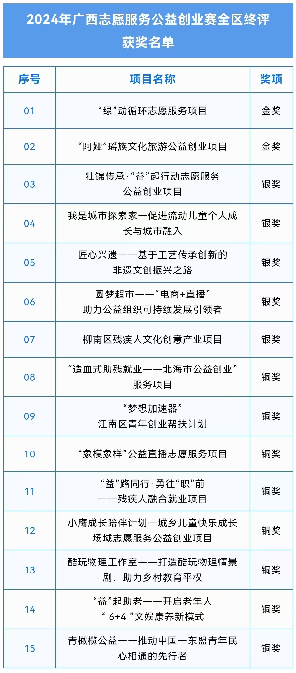 经过激烈角逐,“模拟池塘”——场景式青少年防溺水生命教育项目、“绿”动循环志愿服务项目等7个项目荣获金奖,马山县百龙滩镇“围裙帮办”移风易俗志愿服务项目、壮锦传承·“益”起行动志愿服务公益创业项目等15个项目荣获银奖,梧州市“银发专家乡村行 智技下乡助发展”志愿服务项目、“造血式助残就业——北海市公益创业”服务项目等23个项目荣获铜奖。主办单位将通过入驻志愿服务项目孵化基地、推送参加中国青年志愿服务项目大赛和公益创业赛、参与国际志愿服务项目和给予扶持资金等方式资助获奖项目。