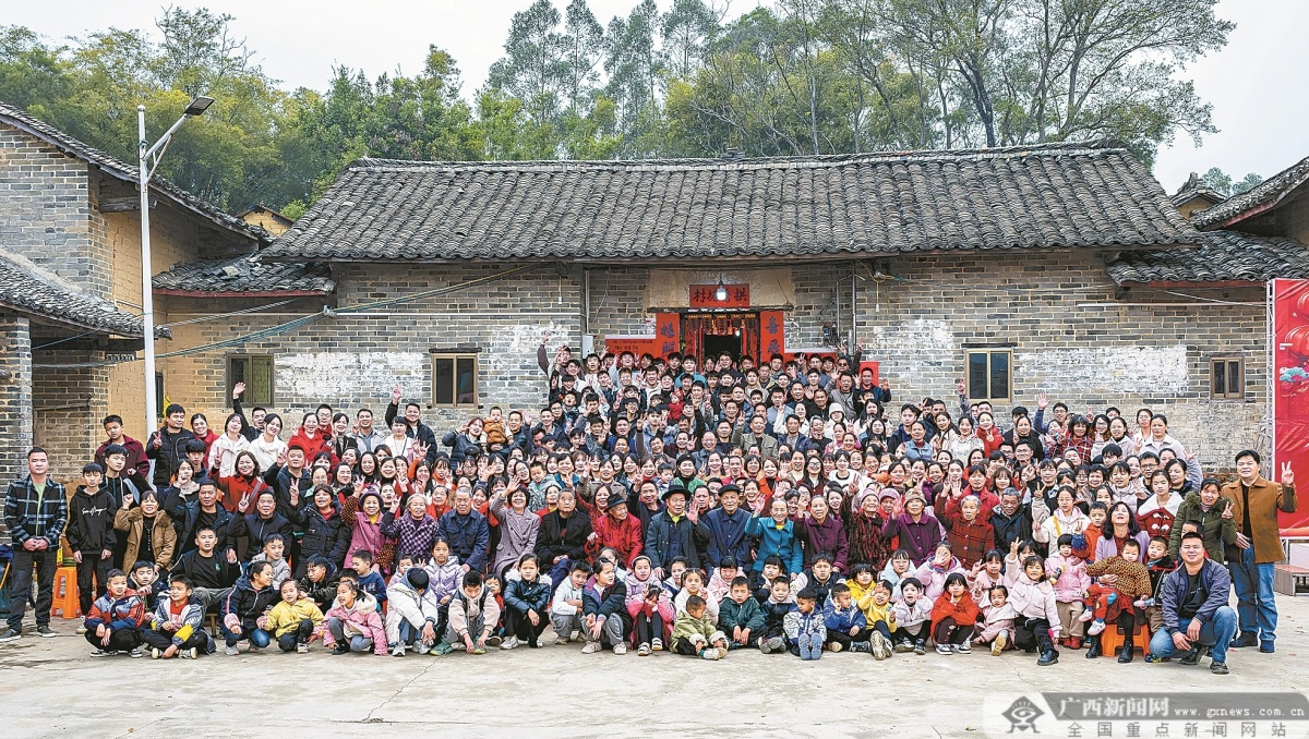2023年1月23日,灵山县沙坪镇七里村拱秀堂屯的李氏兄弟姐妹200多人在百年祖屋前合影。由于平陆运河建设的需要,当地20多户居民进行搬迁。刘世旭 摄