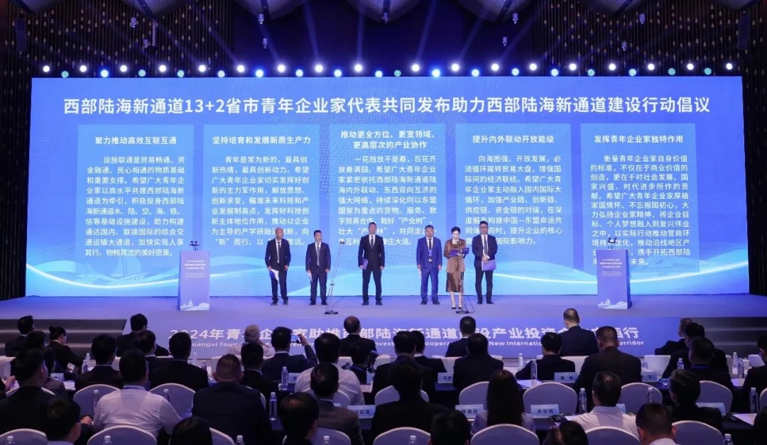 满怀青春的激情与豪迈,“13+2”省市青年企业家代表共同发布了助力西部陆海新通道建设行动倡议。倡议呼吁:广大青年企业家厚植家国情怀、不忘报国初心,主动对接国家重大战略,聚力推动高效互联互通,助力构建通达国内、连接国际的综合交通运输大通道,加快实现人享其行、物畅其流的美好愿景;坚持培育和发展新质生产力,瞄准未来科技和产业发展制高点,发挥科技创新主体地位作用,推动以企业为主导的产学研融通创新;推动全方位、宽领域、高层次的产业协作,加强产业链、创新链、供应链、资金链的对接,以实际行动推动营商环境持续优化,推动沿线地区产业转型发展,助推西部陆海新通道加速延伸、跨越山海、联结世界。