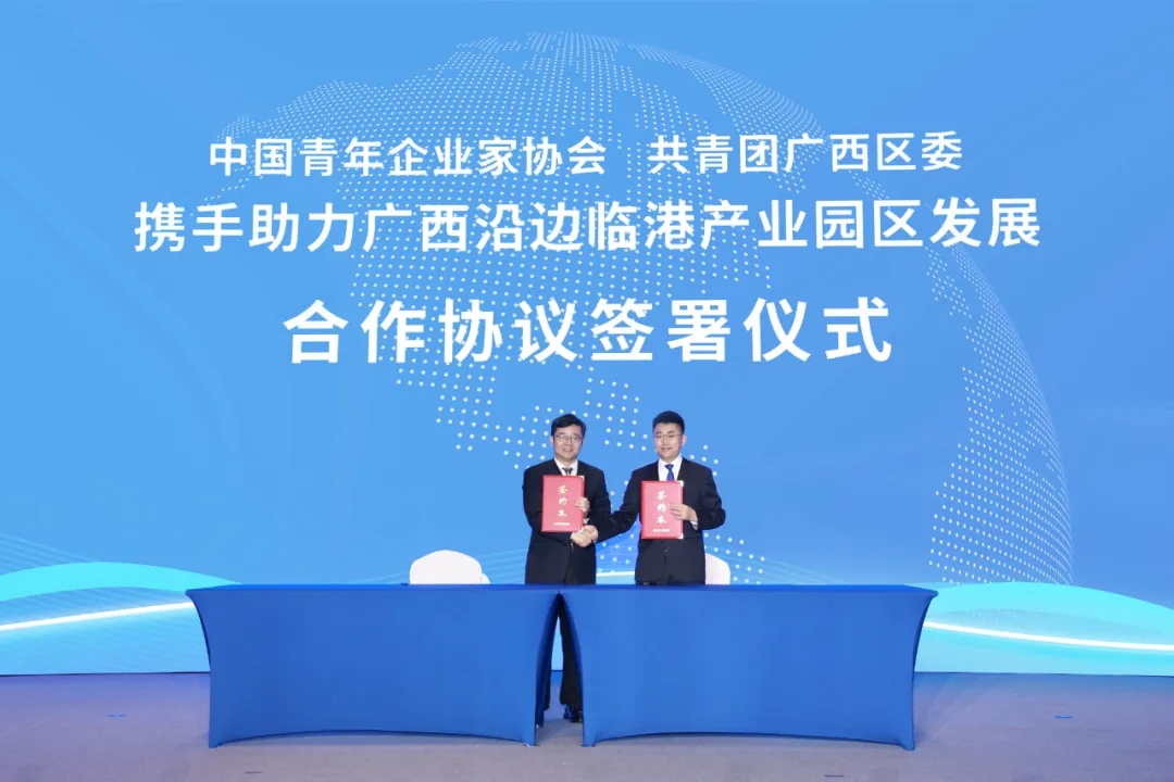 开幕式上,中国青年企业家协会与共青团广西区委签署《携手助力广西沿边临港产业园区发展合作协议》,提出充分发挥协会资源优势和广西场景优势,共同合作共建青年企业家开放合作平台,打造青年企业家人才服务阵地,助推青年企业家项目落地广西,为服务广西“一区两地一园一通道”建设凝聚青年企业家力量。