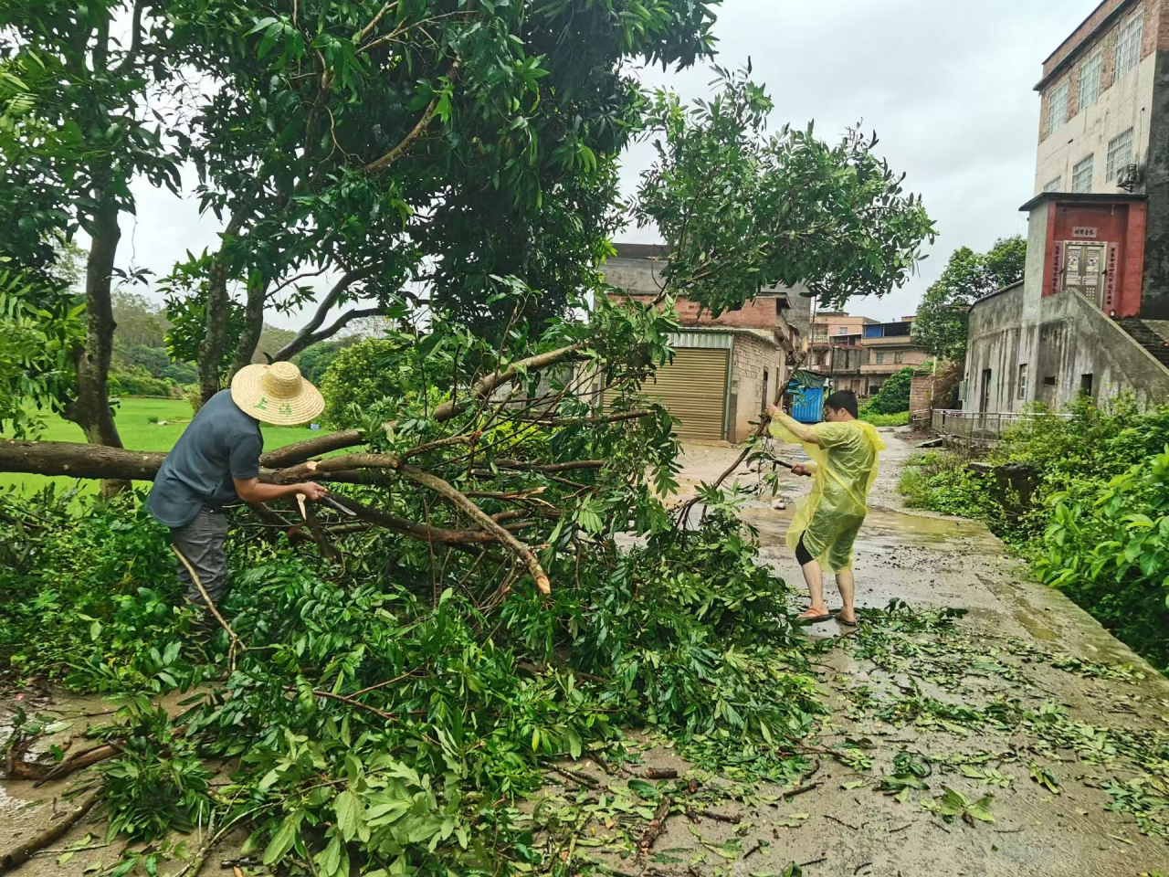 台风过境后,一片狼藉。那蒙镇团员青年又迅速开始参与灾后处置工作,冒雨清理树木、查看受灾农作物、安慰老弱幼群体。
