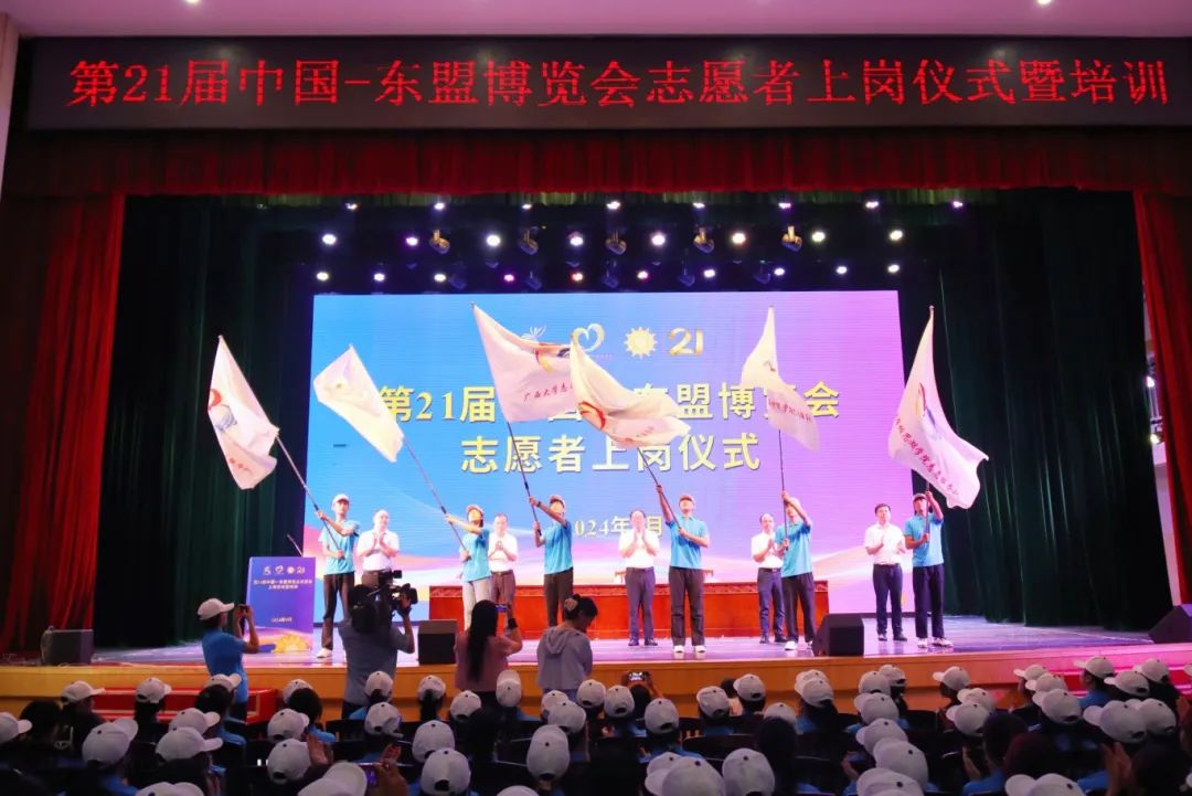 2024年9月13日,第21届中国—东盟博览会志愿者上岗仪式在广西大学举行,共青团广西区委、自治区教育厅、广西国际博览事务局和广西大学的相关负责同志,以及890名东博会志愿者“小青芒”参加上岗仪式。