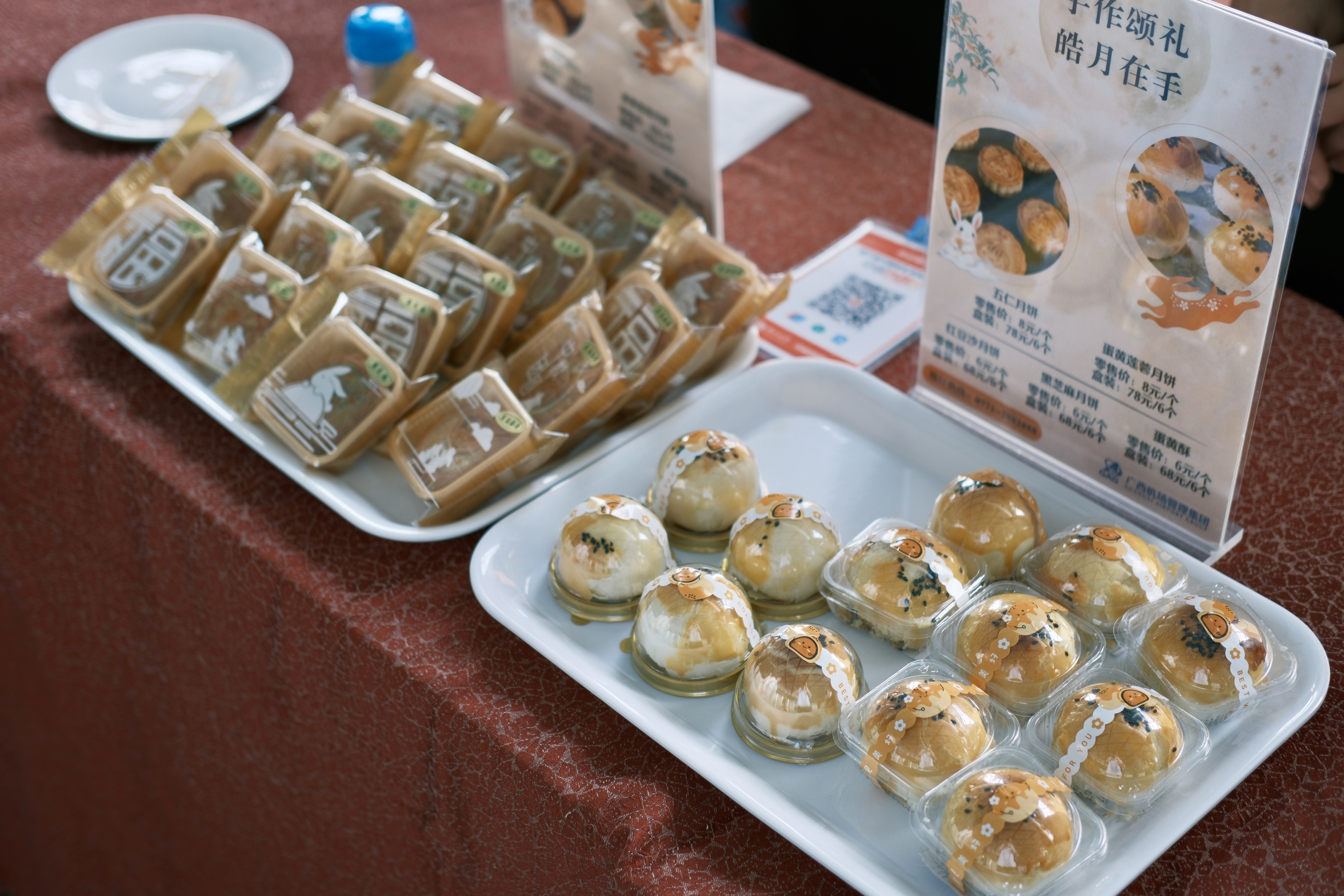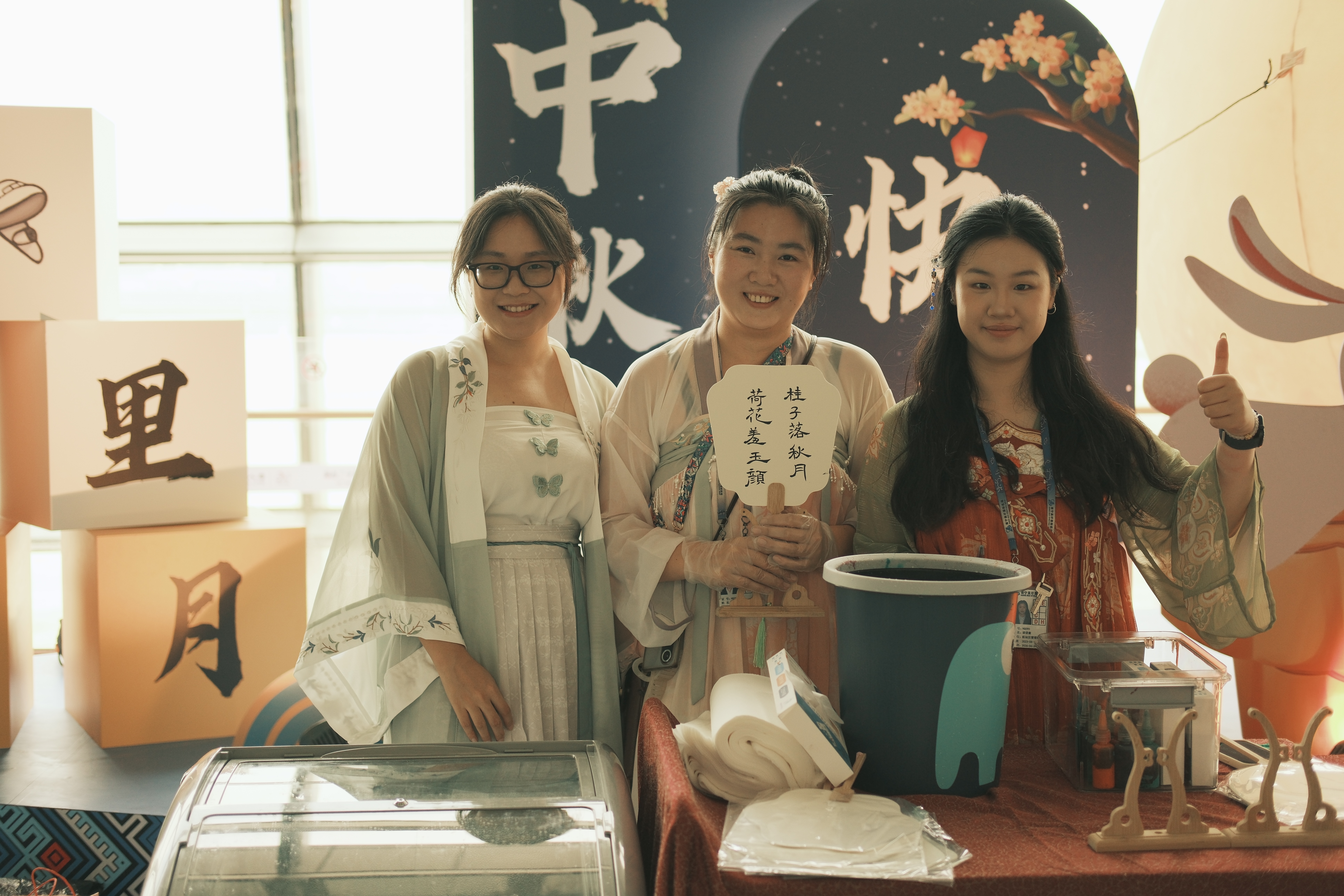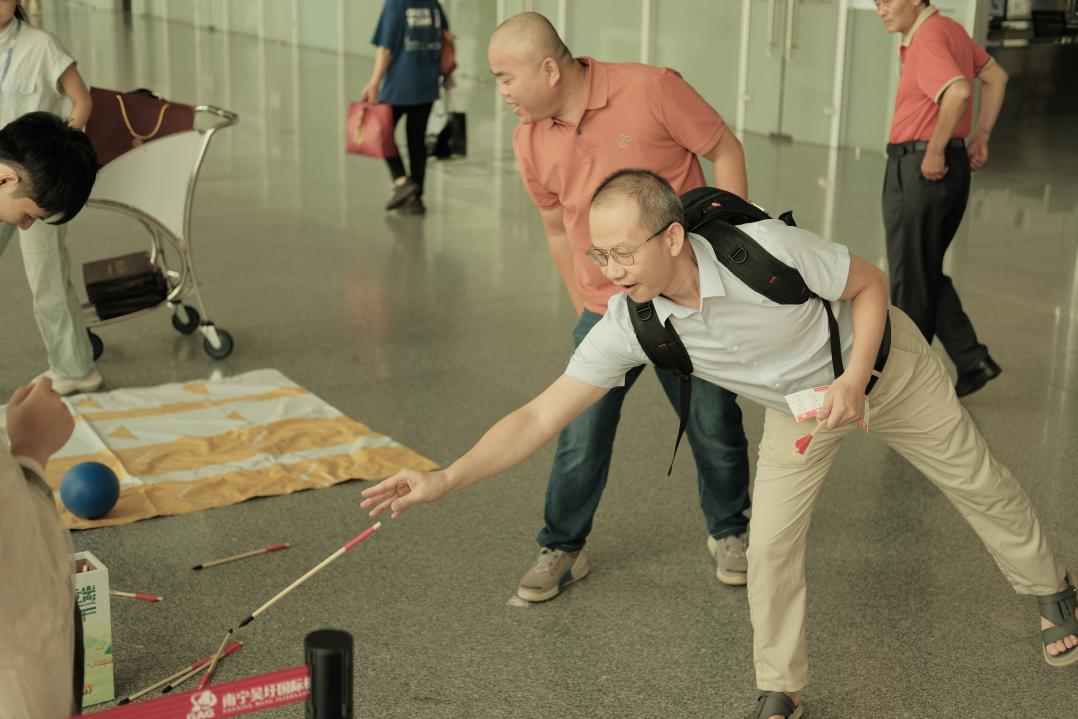 南宁机场精心布置了活动现场,背景以一轮硕大的“明月”为主题,可爱的“桂飞飞”“桂圆团子”人偶与来往旅客亲密互动,许多大朋友与小朋友纷纷合影留念。身着汉服的工作人员邀请旅客参加投壶、猜灯谜等丰富多彩的游戏,现场还设置了非遗漆扇制作,并精心准备了美味的月饼和蛋黄酥。让旅客在浓郁的中秋氛围中感受到南宁机场的独特魅力和文化底蕴。
