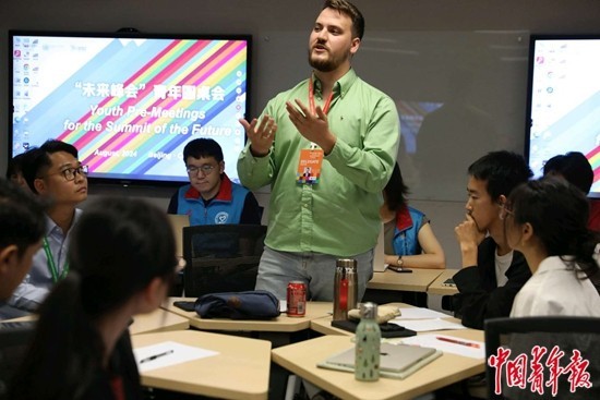 8月13日,北京,“未来峰会”青年圆桌会在中国人民大学举办,中外青年代表围绕联合国未来峰会五个议题进行分组发言和讨论。图为匈牙利全国青年理事会副主席彼得·大卫·西蒙发言。中青报·中青网记者 陈剑/摄