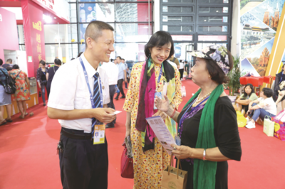 王威(左一)在展馆会场向展商提供票务咨询。(资料图) 梁竞辉 摄