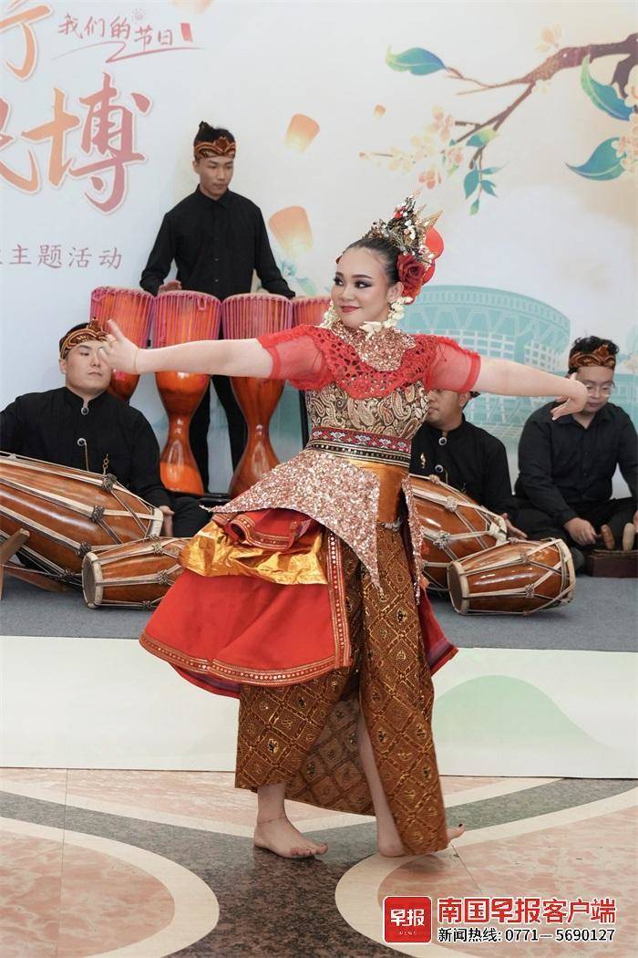 课余,郭俞廷就带学生出去演出。今年中秋节假期,郭俞廷在广西民族博物馆为游客献上了一支印度尼西亚的独舞,充满活力和青春气息的舞蹈,让不少游客陶醉其中。郭俞廷介绍,东盟国家的舞蹈与中国传统舞蹈有不同之处。在编排方面,中国的舞蹈不仅要考虑舞蹈动作,还需要有起伏、转折的情节来吸引观众;东盟国家的舞蹈自带快乐基因,主打一个“开心就好”,不讲究情节的铺垫。