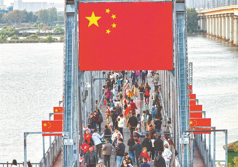 国庆将至,在哈尔滨滨洲铁路桥上,上百面五星红旗鲜艳夺目,不时有市民在国旗下拍照留影。 图片来源:视觉中国