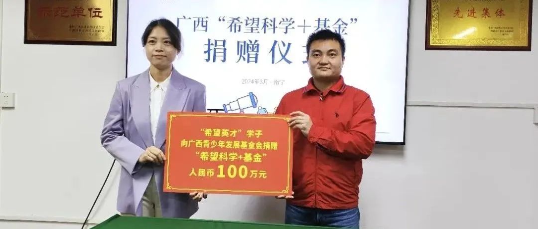 现场,陈宇良分享了他在2013年获得希望工程助力,成为“广西青年英才助学金”获得者,得以顺利拿下博士学位,并立下“十年反哺之约”的故事。他希望通过自己的捐赠,为更多孩子打开通往科学世界的大门,让他们能够在知识的海洋中畅游,探索未知的世界。同时,带动更多青年科普志愿者参与希望工程主题活动。
