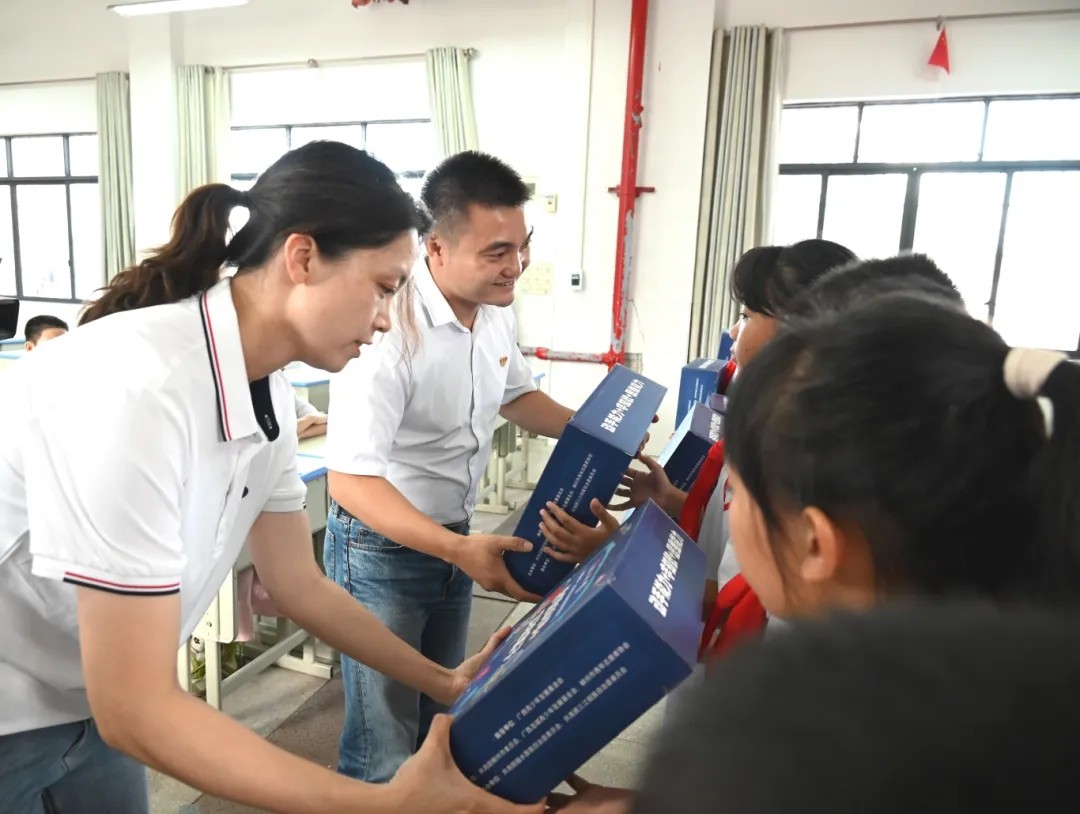 “加油,好好学习!”在“希望科学+”公益志愿服务活动现场,陈宇良给孩子们送上“希望科学+”实验盒子,并鼓励他们。