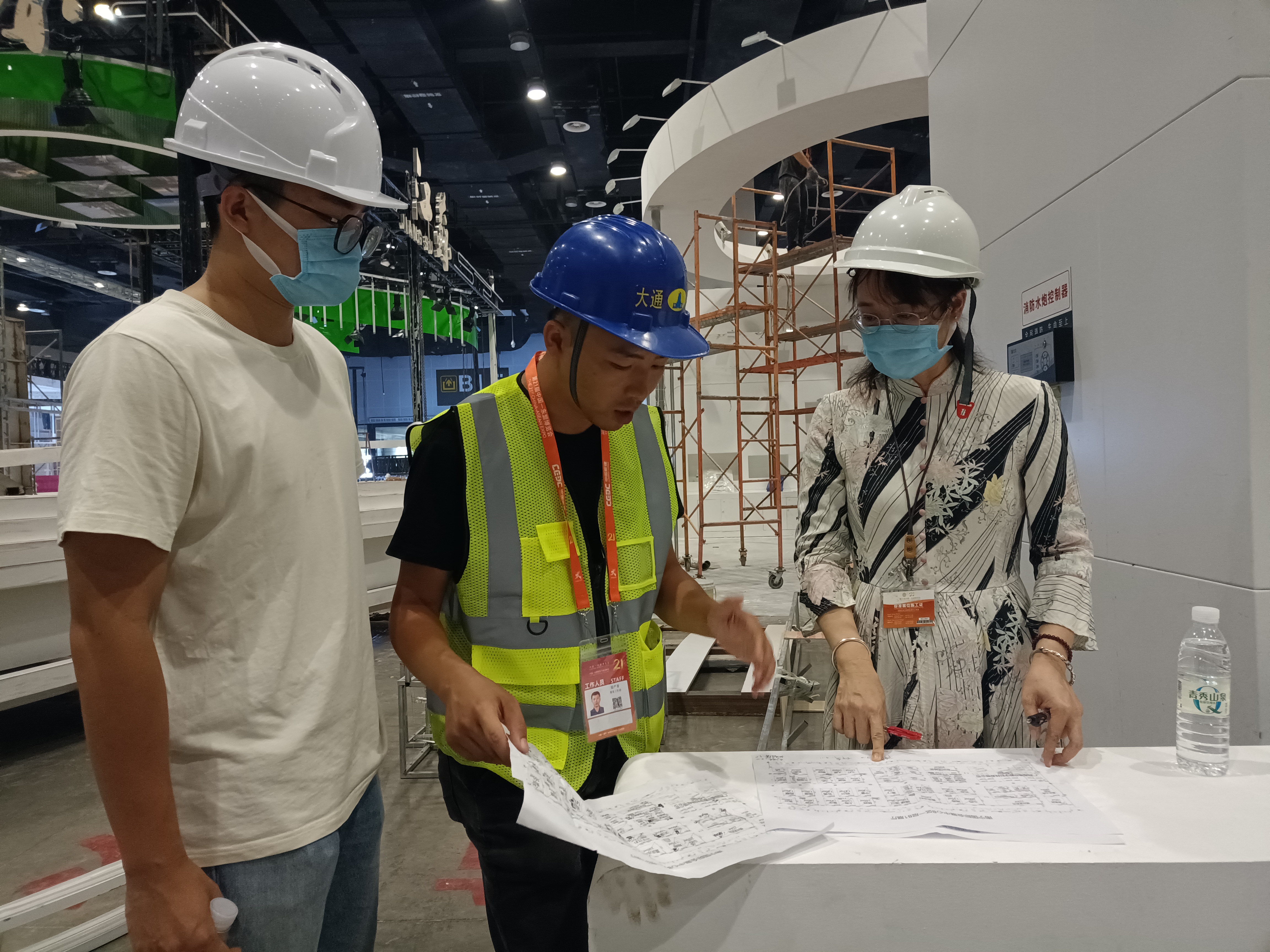 9月18日南宁市直机关服务“东博会和峰会”青年突击队员李平平(右一)和韦林锋(左一)在东博会展馆布展期间跟展馆监理核对展商进馆情况。