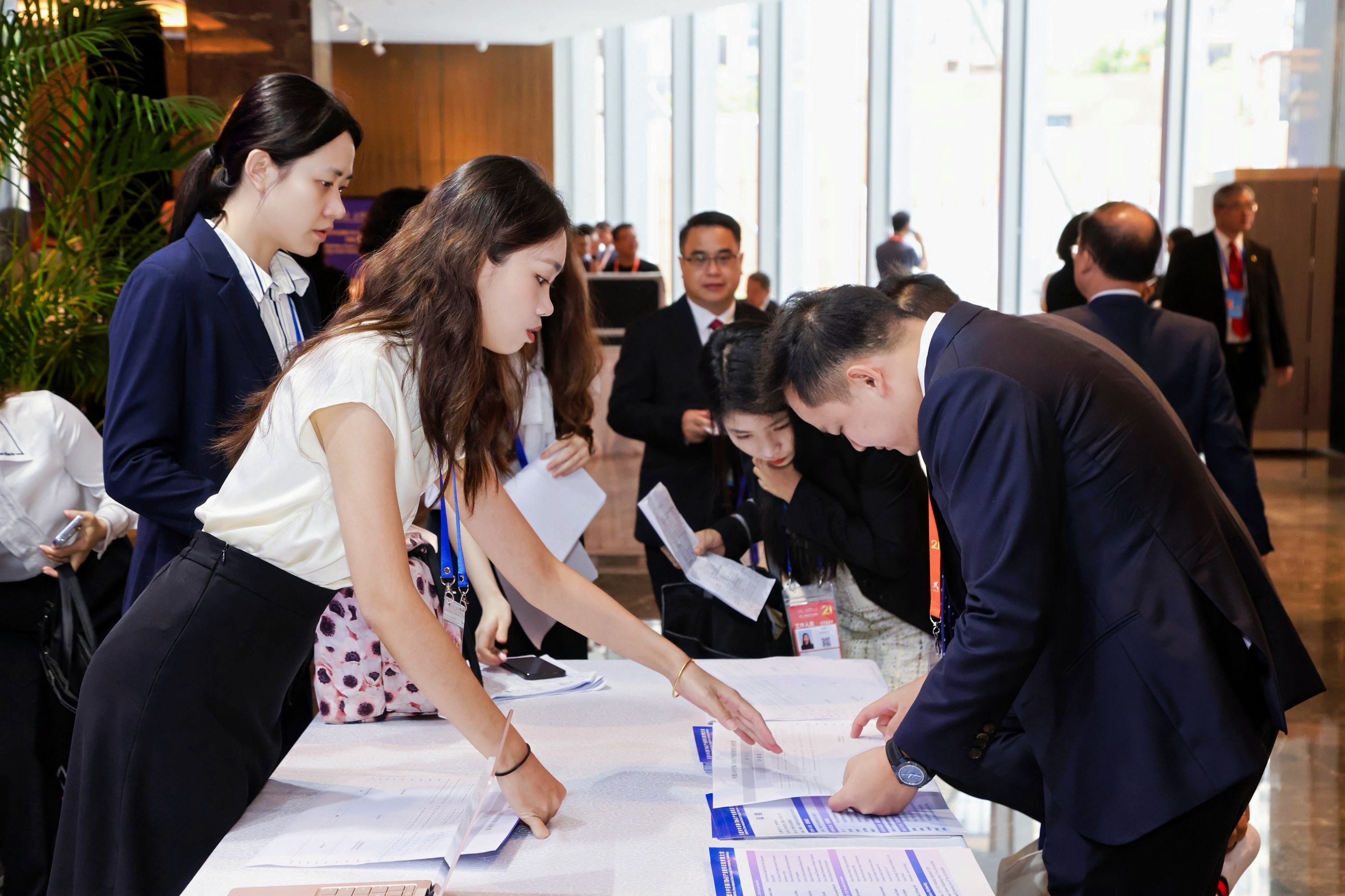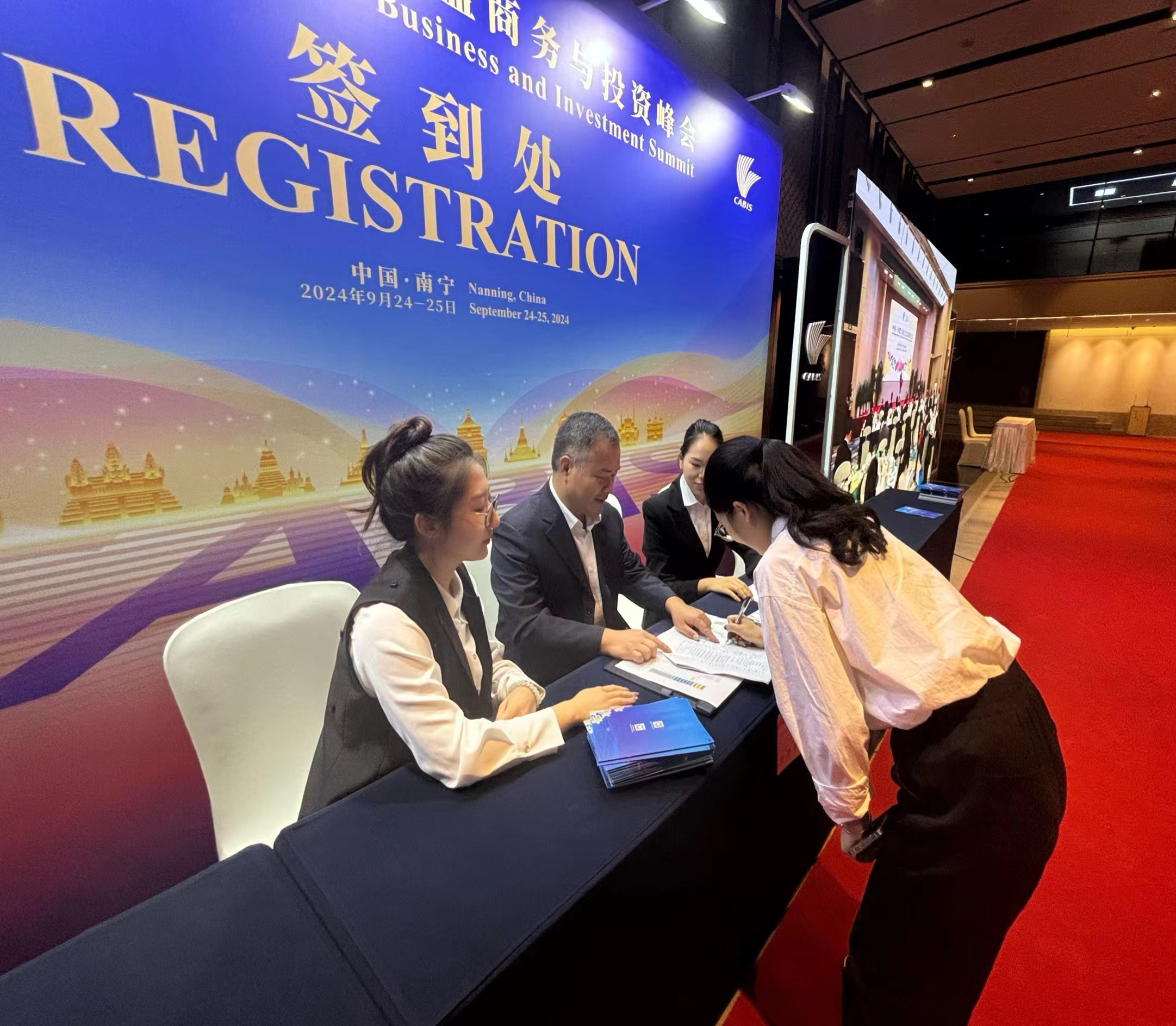 9月25日南宁市直机关服务“东博会和峰会”青年突击队员吴盈萱(左一)在第21届中国—东盟商务与投资峰会签到处负责签到工作。