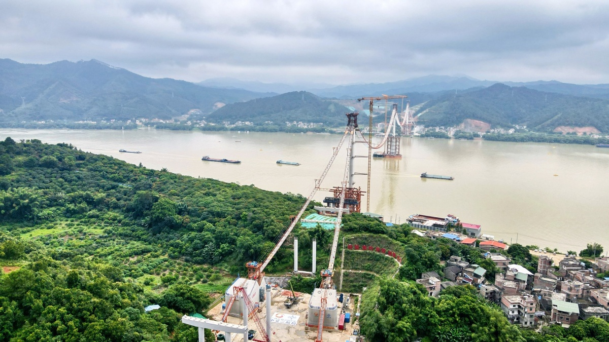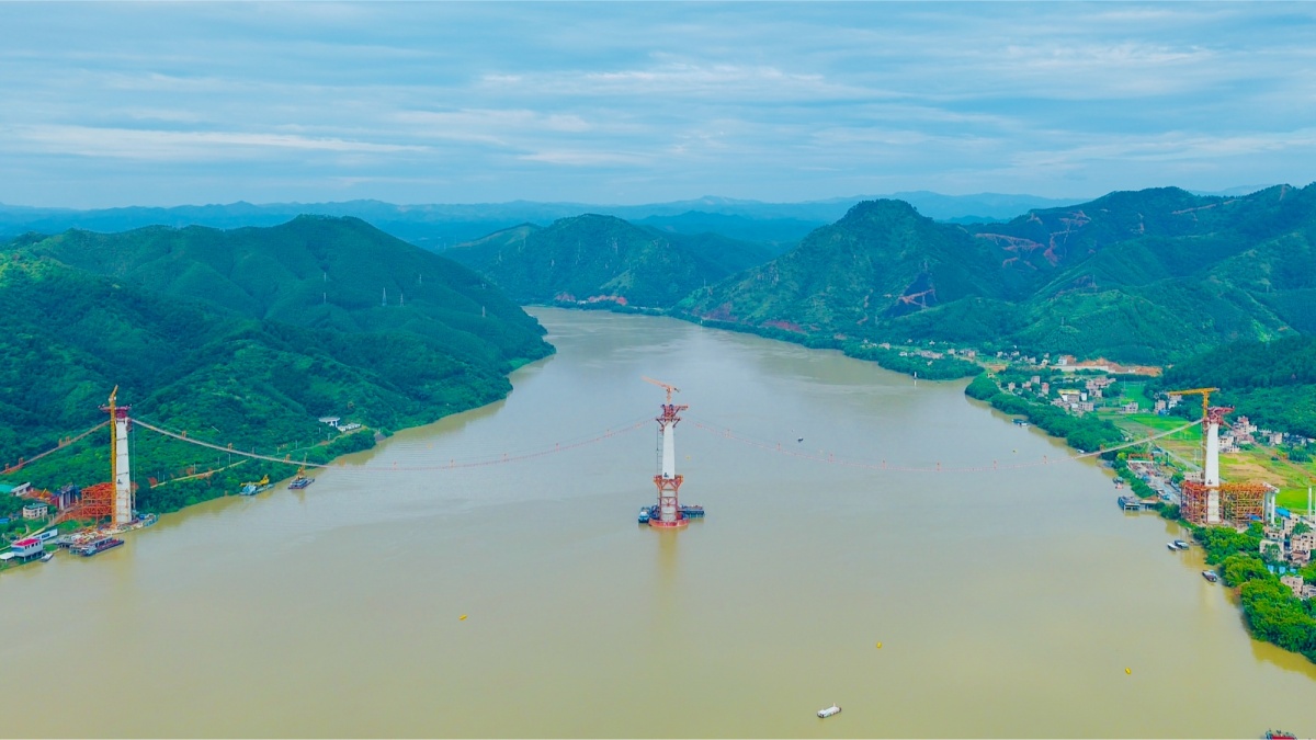 苍梧至容县高速公路苍容浔江大桥首根主缆索股架设现场(广西交通投资集团 供图)