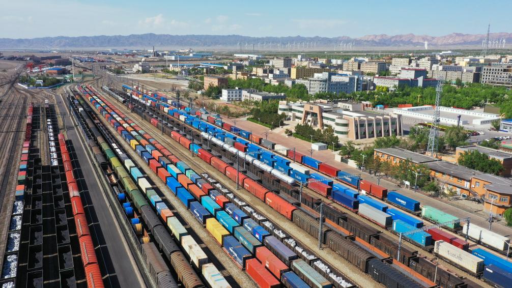 2024年5月25日,在新疆阿拉山口站宽准轨编组场,出入境中欧班列集结等待出发(无人机照片)。新华社发(于晖 摄)
