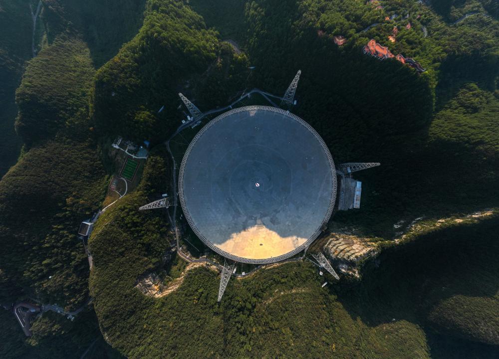 中国天眼在落日余晖中(无人机照片,维护保养期间拍摄,2024年9月25日摄)。新华社记者 刘续 摄