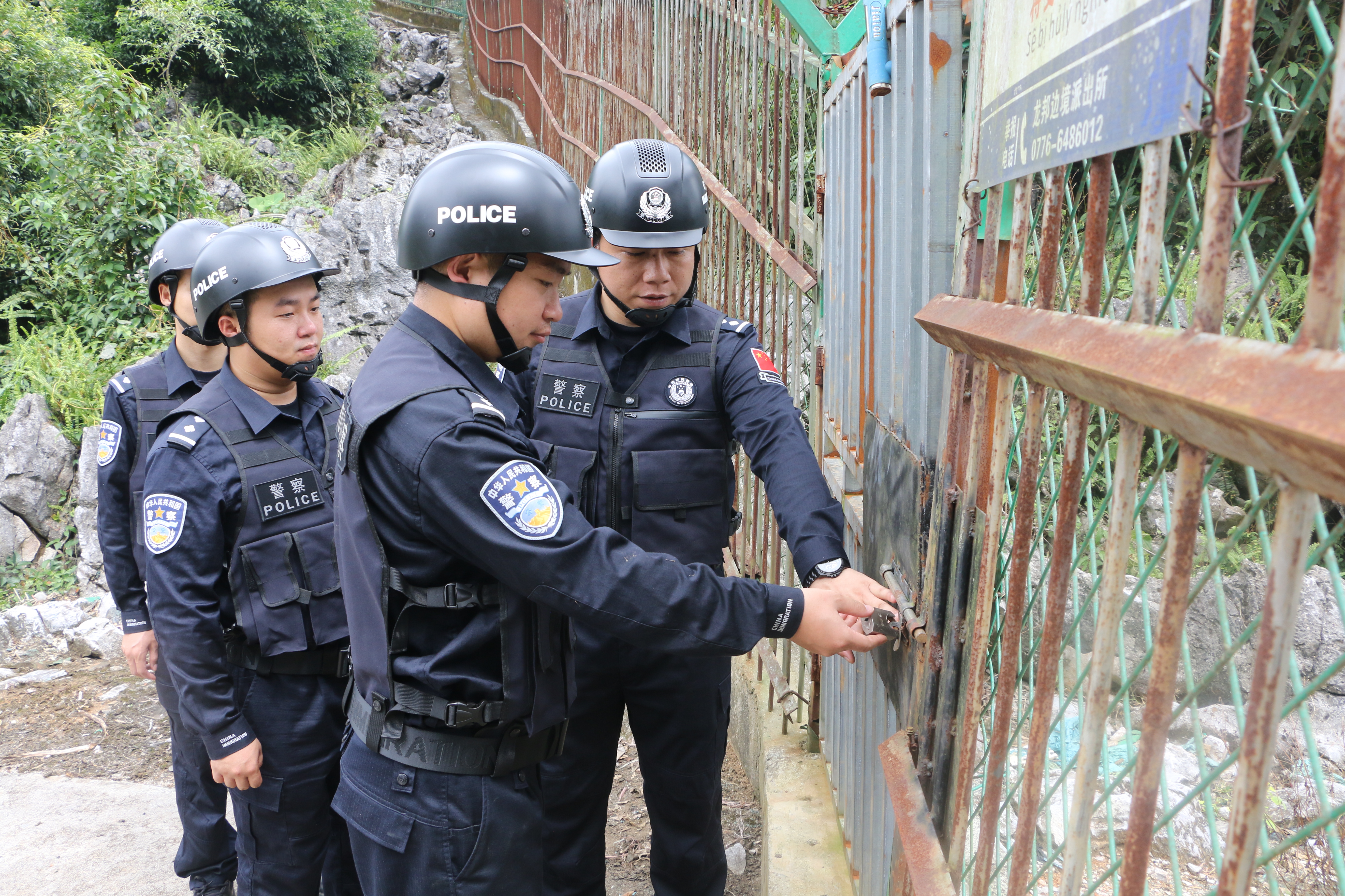 图为百色边境管理支队移民管理警察检查边境拦阻设施