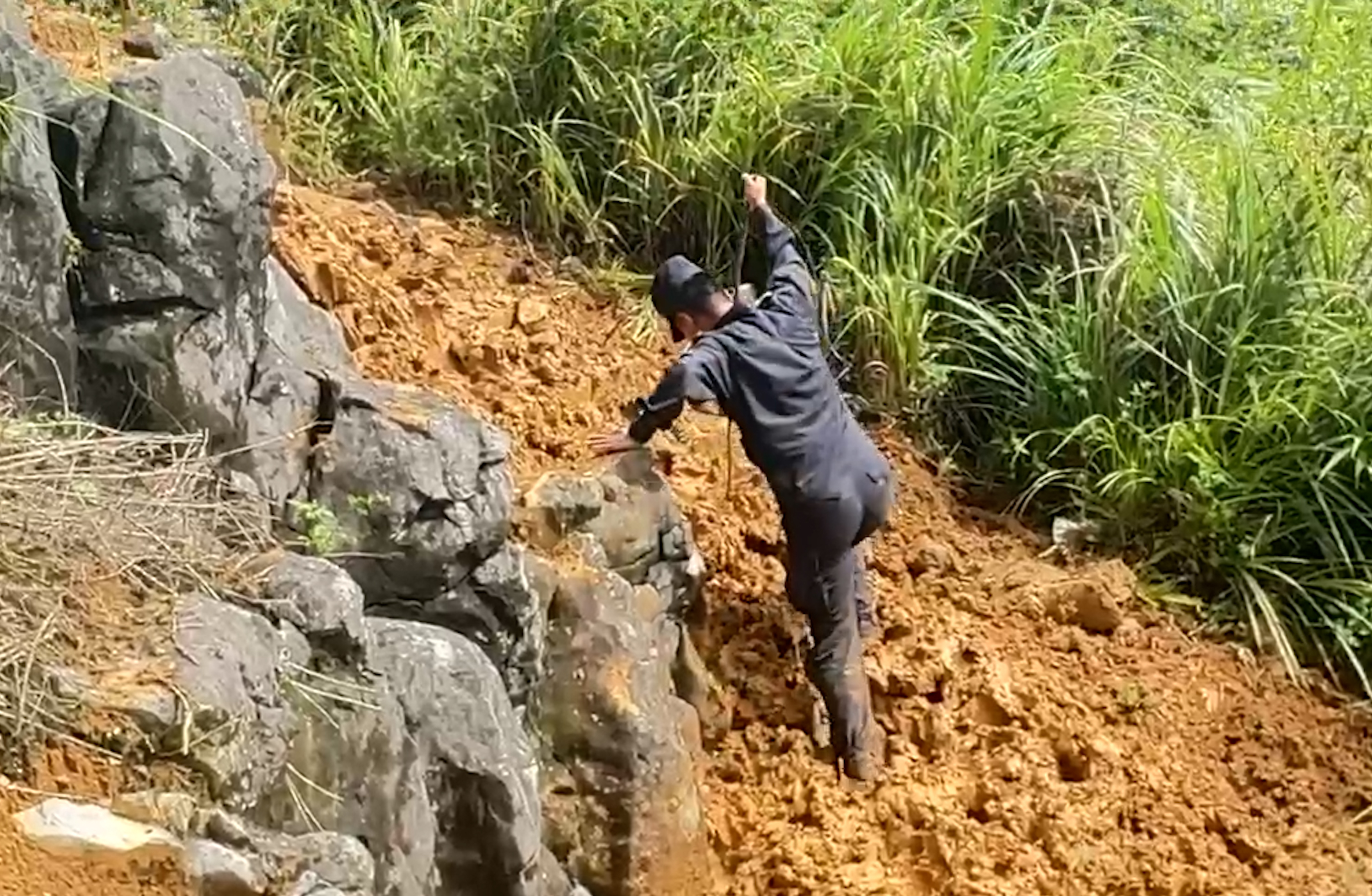 图为百色边境管理支队移民管理警察巡逻期间穿越泥泞的边境山路