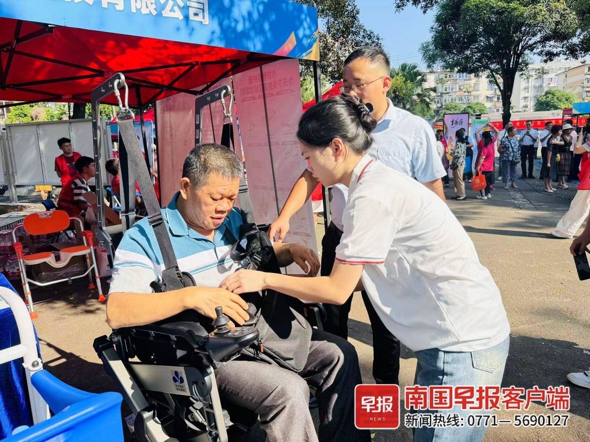 “这台机器我可以体验一下吗?”活动现场,社区居民韦先生对一台助力失能老人的康复以及日常出行的智能行走机器人十分感兴趣,他坐上去体验了该机器的便捷功能。韦先生的母亲已有87岁,行走不便,他便关注这些前沿辅具设备。韦先生还相中了一款帮助失能老人洗澡的机器,希望厂家能推出更实惠的平替款。