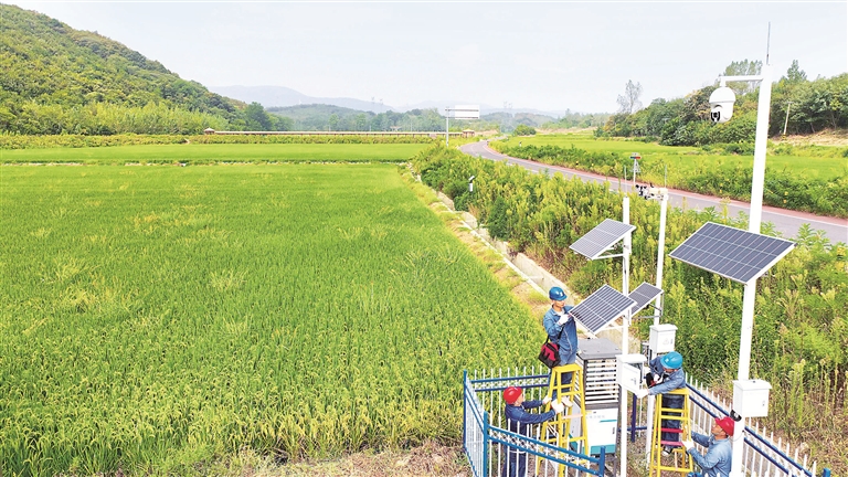 近年来,安徽省滁州市南谯区积极推动高标准农田建设,运用智能科技设备实现农业精准化、智能化和可持续发展,助力粮食稳产增产。图为近日,在南谯区施集镇,工作人员对智能农业监测设备进行调试检修。新华社记者 曹力 摄