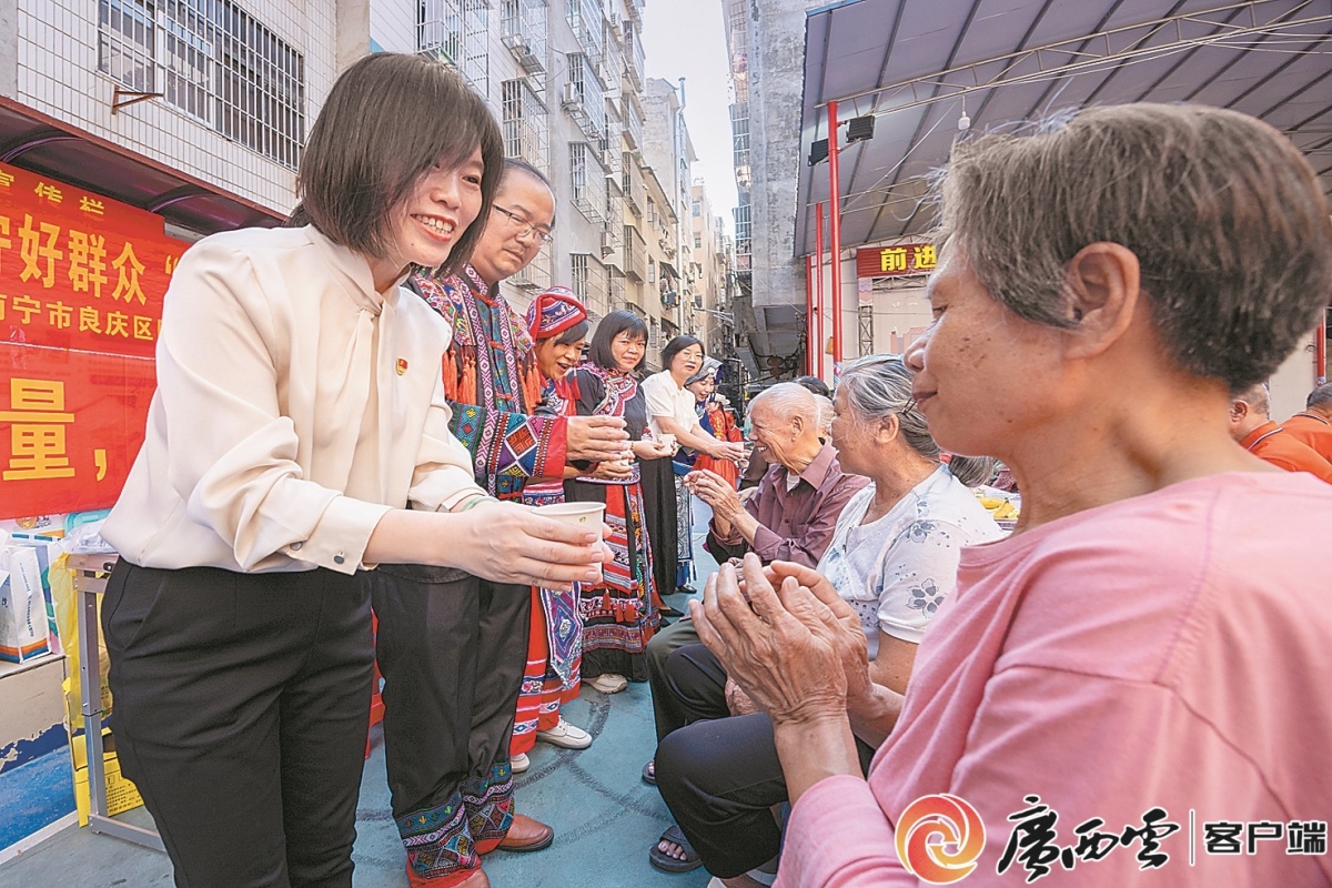 10月10日,南宁市良庆区前进社区开展丰富多彩的活动喜迎重阳节,营造关心关爱老年群体的浓厚社会氛围。图为社区工作人员向老人们敬茶。江真 摄