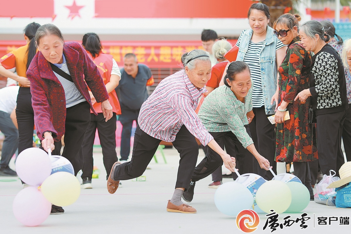 10月9日,永福县永福镇渔洞村举行重阳节游园活动,村里200余名70岁以上老人参加蒲扇扇气球、投壶、套圈等互动游戏。李忠波 熊霞 摄