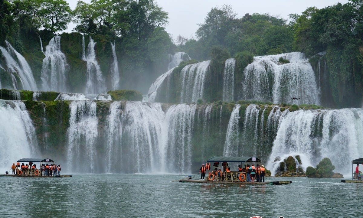 在德天跨国瀑布景区,游客乘舟近距离感受瀑布的壮观。孔繁啸 摄